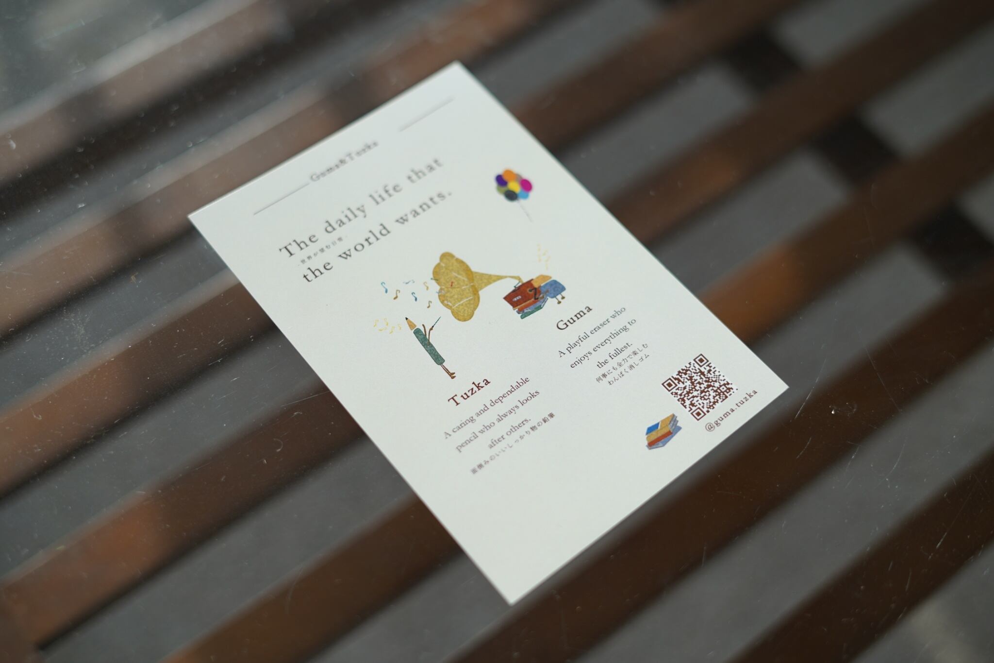 えんぴつと消しゴムをモチーフにしたキャラクター、グーマとトゥシュカが平和な日常を過ごすワンシーンを描いたデジタルアートです。