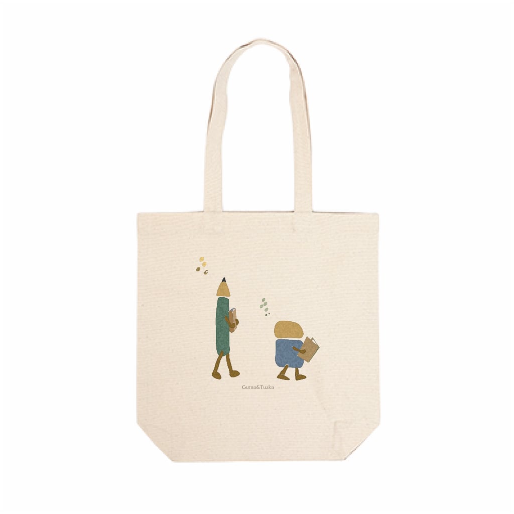二人は本屋さんで好きな本を見つけ、ワクワクしながら帰路につく。鉛筆のTuzka(トゥシュカ)は帰ってからの楽しみに、消しゴムのGuma(グーマ)は待ちきれず読みながら。